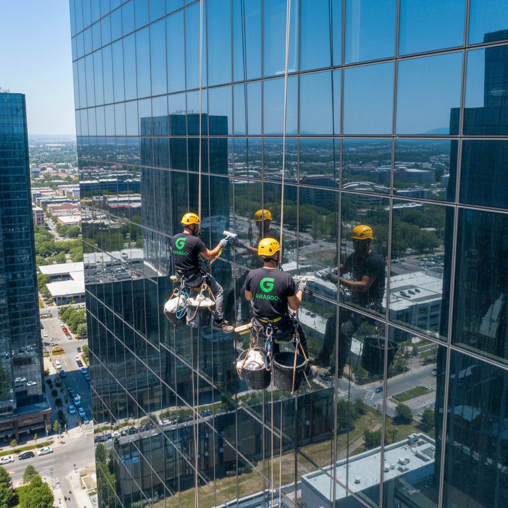 Чистење на стаклени и фасадни површини на висина